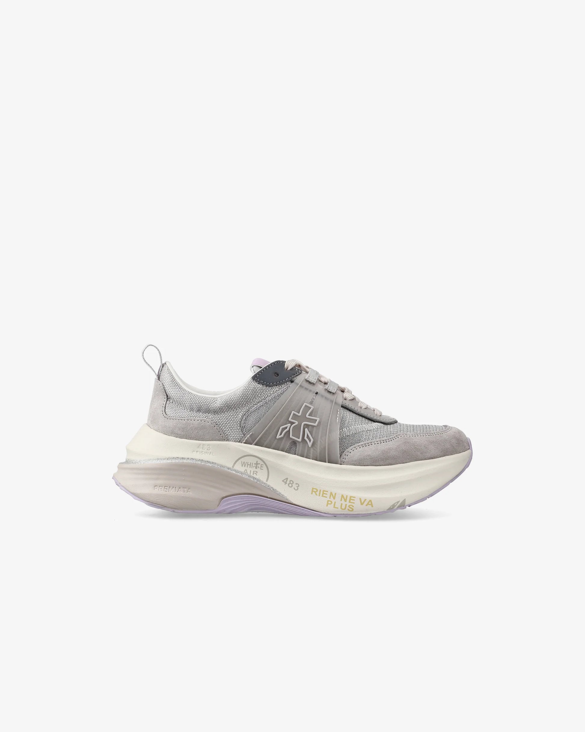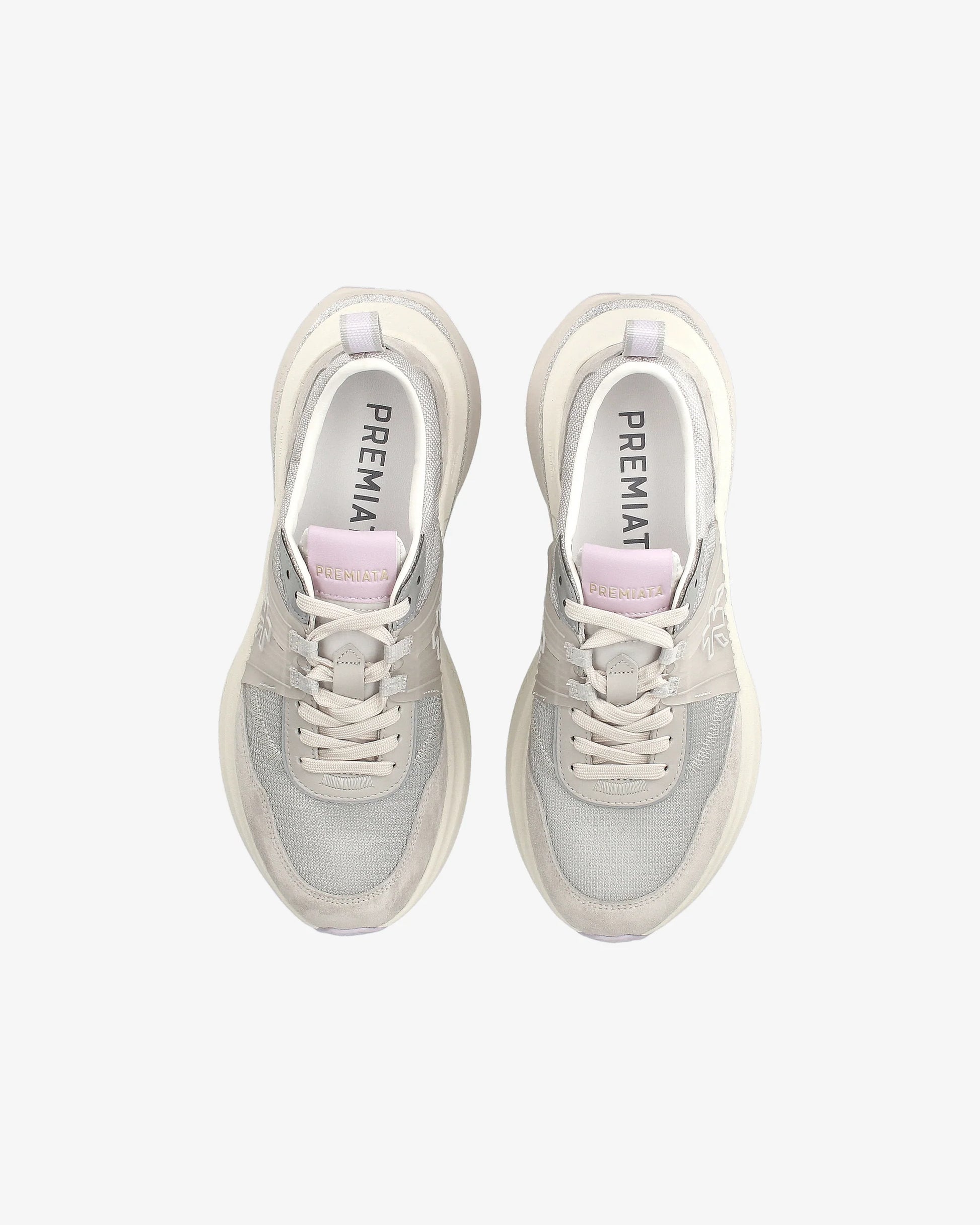 Sneaker da donna modello Hill 7859 in grigio chiaro con design pannellato, linguetta posteriore per aiutare a calzarle, chiusura con lacci, suola platform in gomma. Un must del brand, realizzata con materiali di qualità e inserti colorati per uno stile patchwork iconico.