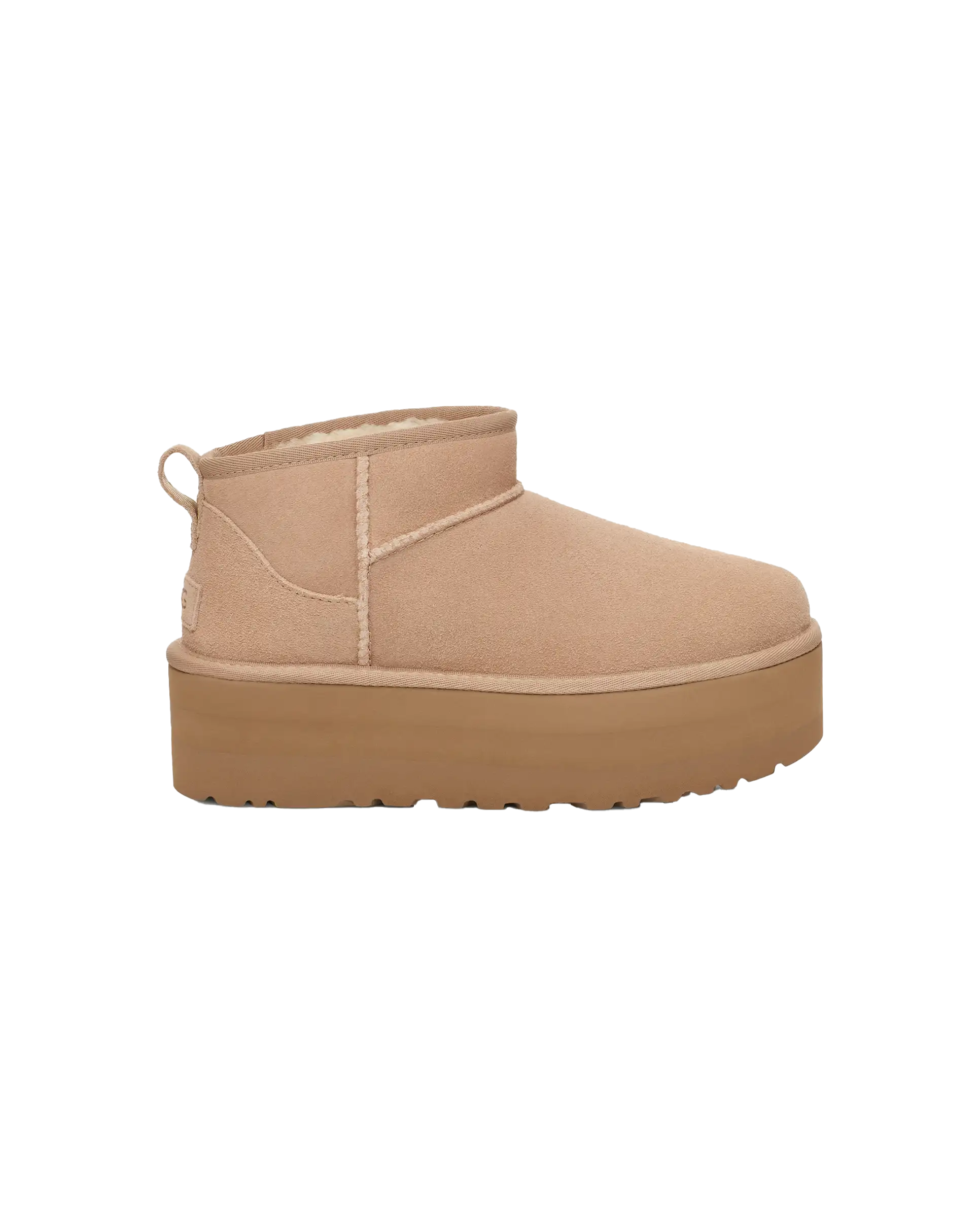 Le UGG Ultra Mini Platform Sand rivisitano l’iconico stivaletto UGG in versione ultra corta e platform. Tomaia in suede color sabbia trattata per resistere a umidità leggera, interno rivestito in soffice lana UGGplush™ per un calore naturale e comfort avvolgente. La suola in EVA Sugarcane/Treadlite by UGG garantisce leggerezza, ammortizzazione e durevolezza, mentre il design minimal e il plateau alto 5,1 cm aggiungono grinta e modernità. La linea ultra mini offre libertà di movimento e la linguetta posteriore facilita la calzata. Perfette per abbinamenti urban con jeans cropped, leggings o gonne midi: praticità, stile e calore per affrontare la stagione fredda.